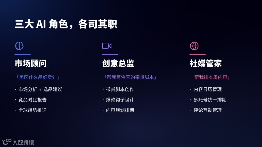 三大AI角色提供24小时专家级服务,成本仅为传统团队零头,赋能中小企业获得与巨头抗衡的竞争力。
