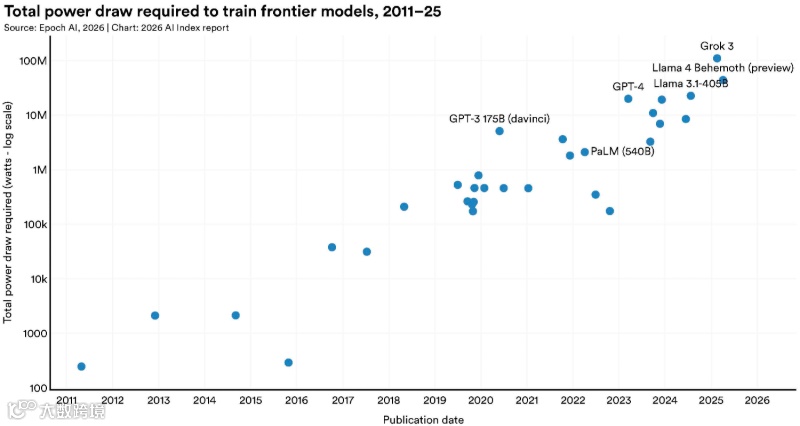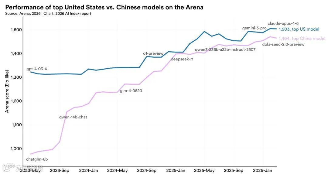 截至2026年3月,美国最强模型与中国的差距仅2.7%,两国模型在过去一年多次交替领先。美国优势集中于算力与资本,坐拥5427个数据中心;中国则在AI论文、专利及机器人部署领域领先。
