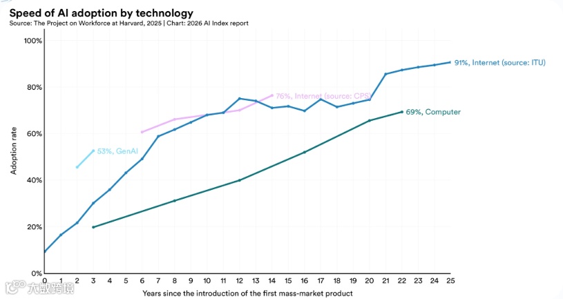 斯坦福HAI人类及人工智能中心发布2026年AI Index报告,核心结论显示:AI全球采纳速度已超越PC和互联网,但社会制度、就业市场及衡量工具严重滞后。