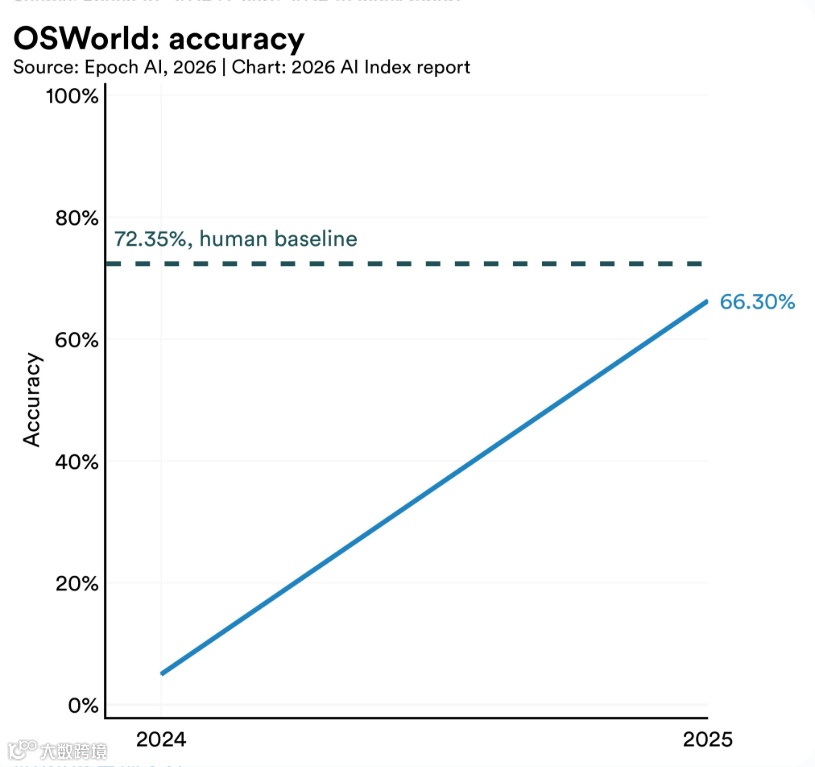 操作系统任务完成率从12%提升至66.3%,网络安全任务达93%,接近人类水平。但整体失败率仍超30%,且企业部署率处于个位数阶段,测试数据与实际应用存在显著落差。