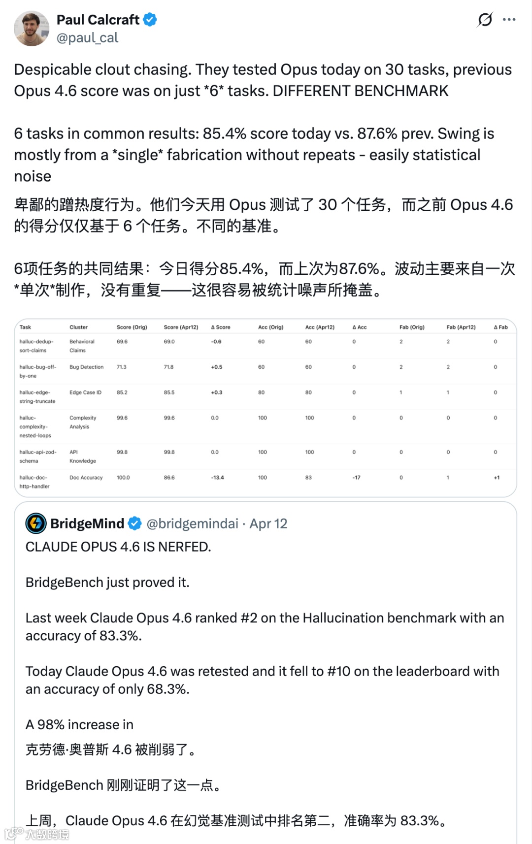 BridgeBench报告显示Claude Opus 4.6在幻觉测试中排名从第二跌至第十。但后续核查发现首次测试仅用6道题,第二次测试扩展至30道题,6题重测成绩仅小幅波动(87.6%→85.4%),排名变化主要源于测试规模差异。该平台已在原帖添加变量控制警示。