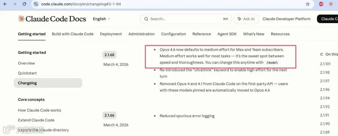 Boris Cherny解释性能变化源于两项调整:2月9日启用"自适应思维"模式,3月3日将默认推理深度由High调至Medium(effort 85)。更新日志显示此举旨在平衡智能性、延迟与成本效率。若需恢复深度思考,用户可设置"/effort high"。