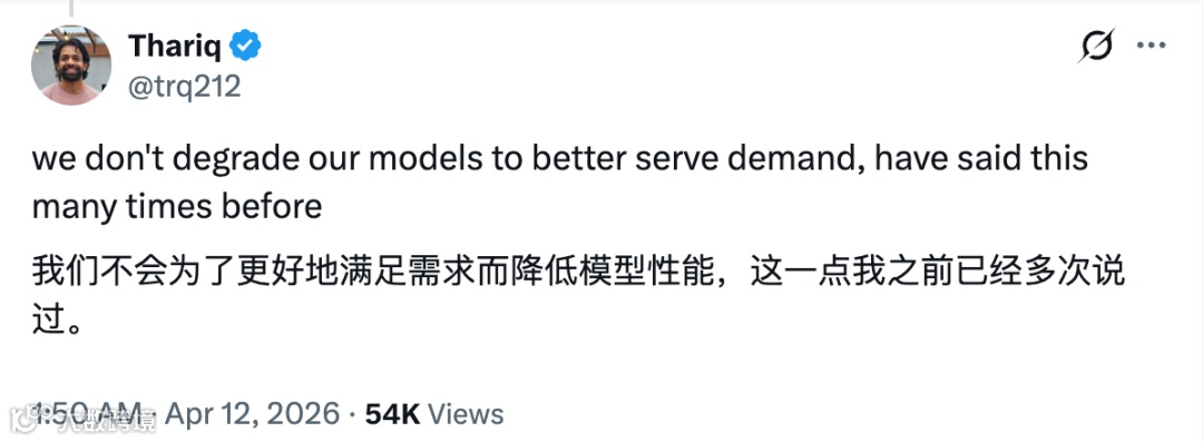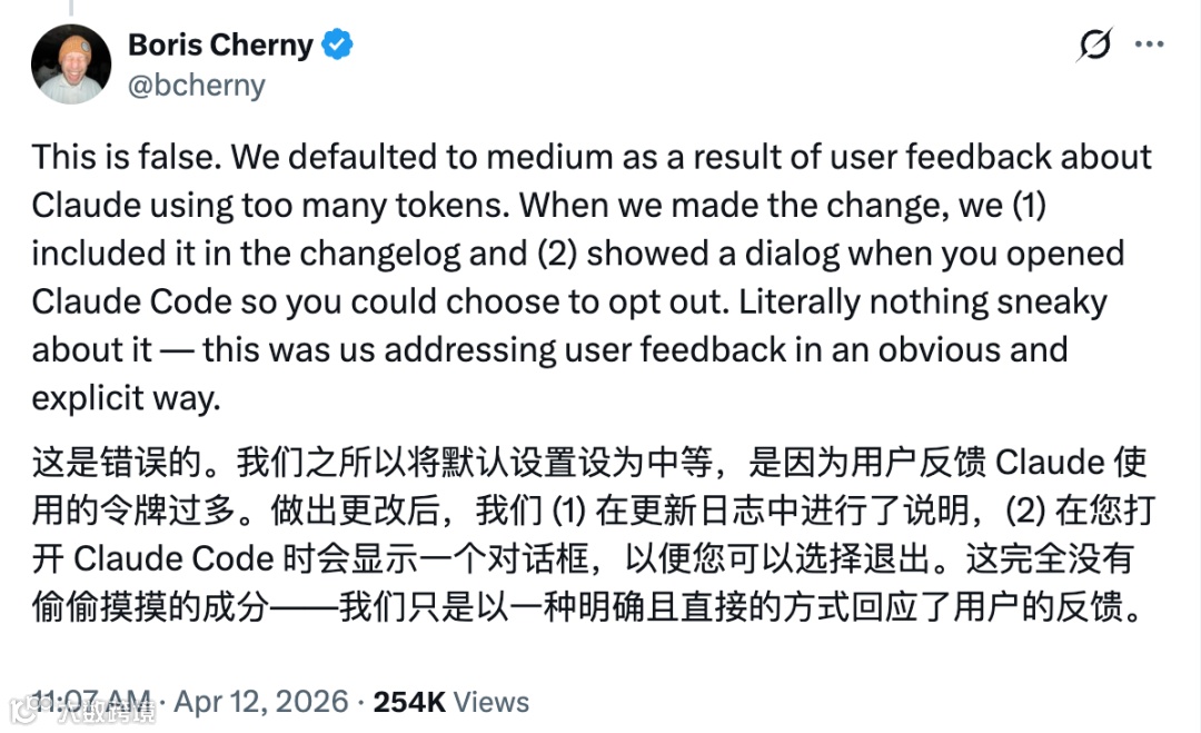 Claude Code负责人Boris Cherny声明性能变化源于用户反馈的Token消耗问题,并非刻意削弱模型。团队成员Thariq Shihipar重申不会为满足内部需求而降低性能。这与去年官方技术