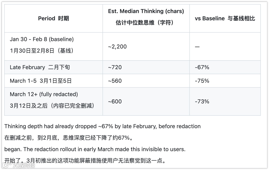 AMD AI总监Stella Laurenzo通过6852份会话分析指出:自2月起Claude推理深度显著下降。关键指标"读写比"从1-2月的6.6骤降至3月后的2.0,三分之一代码修改发生在未读取相关文件的情况下。