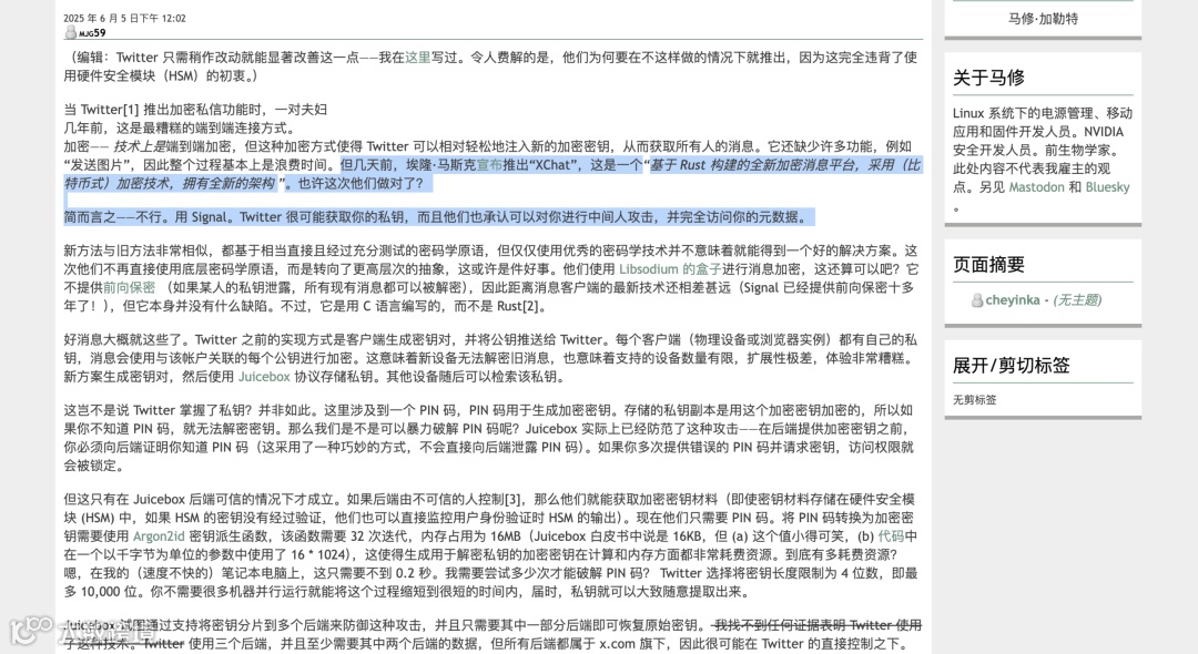 宣传中的“比特币式加密”存在重大隐患:采用经审计的libsodium方案,但核心代码基于C语言而非宣称的Rust架构;密钥管理使用开源Juicebox协议,由X控制的服务器分片存储,缺乏第三方后端支持。
