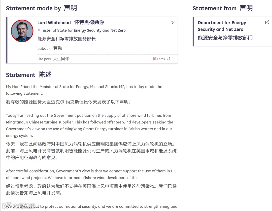 经审慎考虑,政府不支持使用明阳风机于英国海上风电项目。