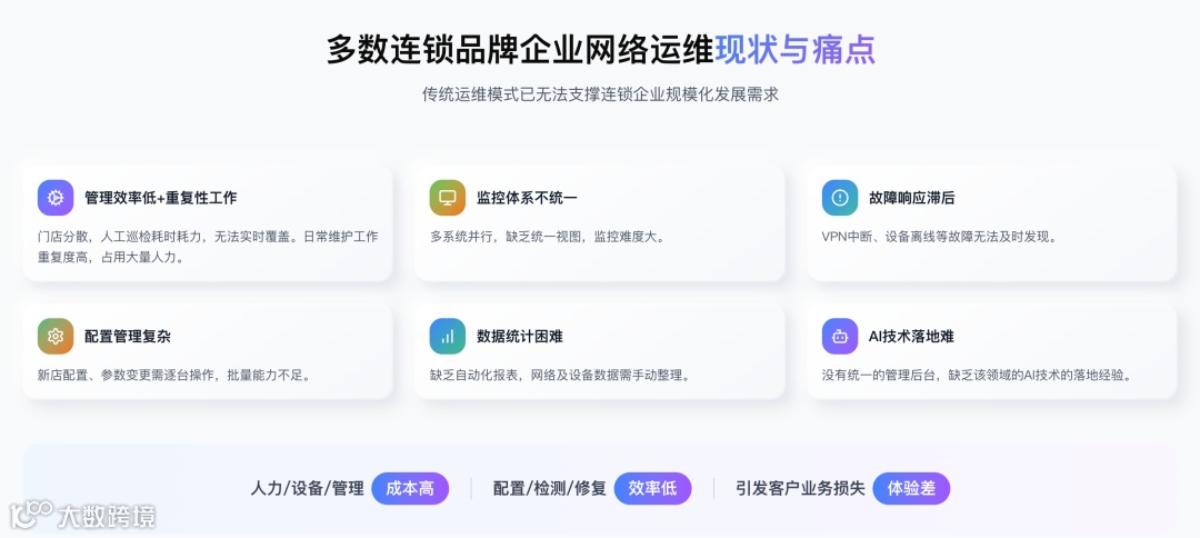 分散式门店导致人工巡检耗时,重复操作占用大量工时。 - 监控体系割裂