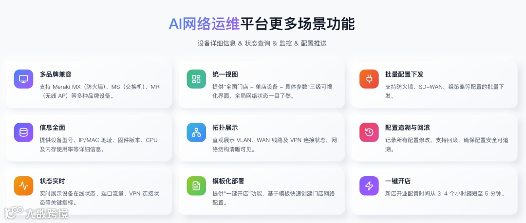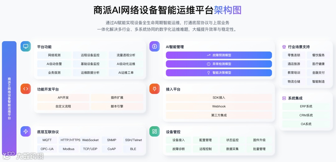 支持Meraki等多品牌设备,兼容MQTT/SNMP/SSH等协议,可无缝对接ERP/CRM系统,适用于零售、餐饮、酒店、医疗等全行业场景。