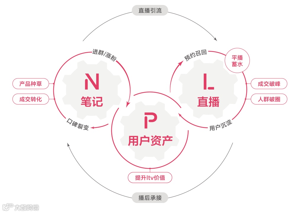 直播实现高效成交、人群沉淀与协同提效,采用"日常种草+大场爆发"模式。全周期管理涵盖播前蓄水、播中转化、播后延续,配合智能工具放大笔记与用户资产流量效果。
