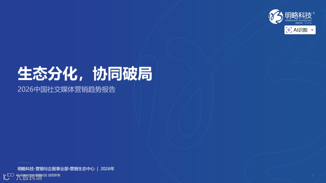 明略科技《2026 中国社交媒体营销趋势报告》指出,2025 年品牌进入主权觉醒阶段,2026 年核心命题转向生态分化下的协同破局。报告以"真实为根基、协同为方法、破局为目标"为逻辑,系统拆解社媒生态变革,提炼可落地趋势与实战路径。