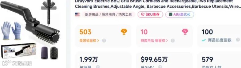 美国市场近期大规模召回传统金属烧烤刷,引发消费者对金属丝脱落混入食材的安全忧虑。在此背景下,中国品牌Drayvorx电动烤架刷迅速抢占市场,成为TikTok美区现象级爆品。该产品28天售出6617件,销售额达38.4万美元,并在平台累计实现总销售额近百万美元(约680万元人民币)。同步在亚马逊美国站月销超4000件,稳居新品榜单首位。