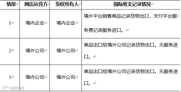 情形二:境外公司入驻、境外公司货权。我国企业先将货物出口至境外子公司,由后者在平台运营销售。货物出口环节即计入我国货物出口,后续平台交易不纳入我国国际收支统计。