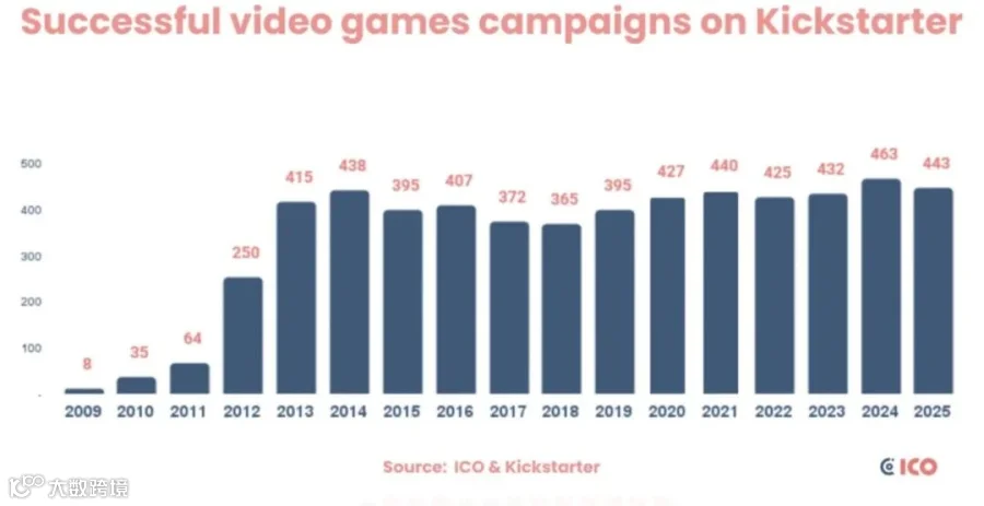 市场研究机构ICO Partners的数据显示,2024年共有463个游戏项目在Kickstarter完成众筹,这一数字创下了该平台的历史纪录。2025年,在Kickstarter网站筹集研发资金的游戏项目数量小幅下降至443个,但仍然位列历史第二。