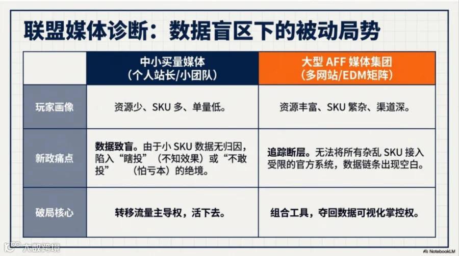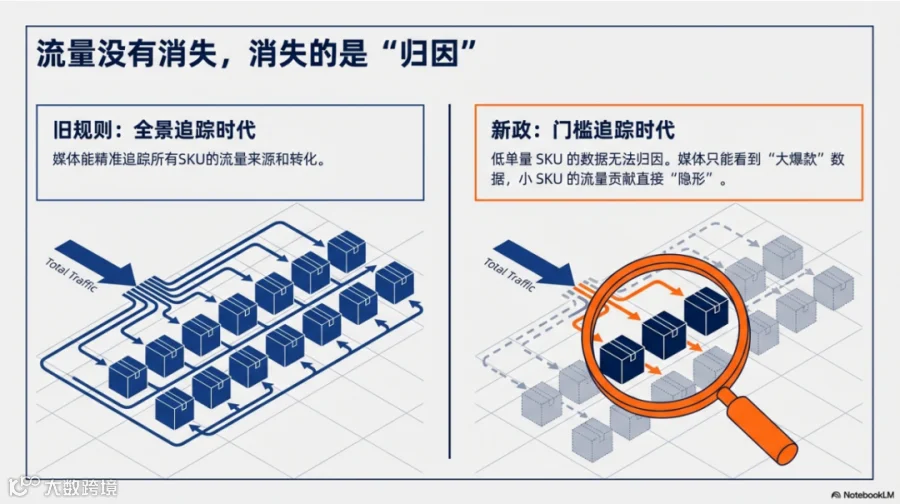 此次调整的核心在于数据追踪逻辑改变:低单量SKU(日销量<4单)的流量贡献无法被归因。过去联盟媒体可精准追踪各SKU转化路径,新政后仅大流量SKU数据可见。