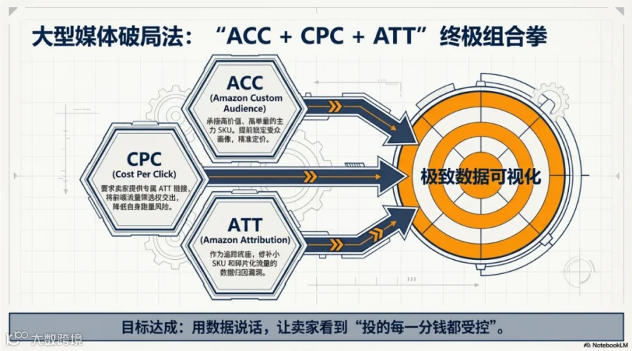 拥有数百渠道的媒体集团可采取"ACC+CPC+ATT"组合拳:ACC承接高价值SKU,CPC通过ATT链接转移流量决策权,ATT补充碎片化流量追踪。核心目标是实现数据全流程可视化,增强与卖家谈判话语权。