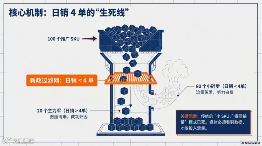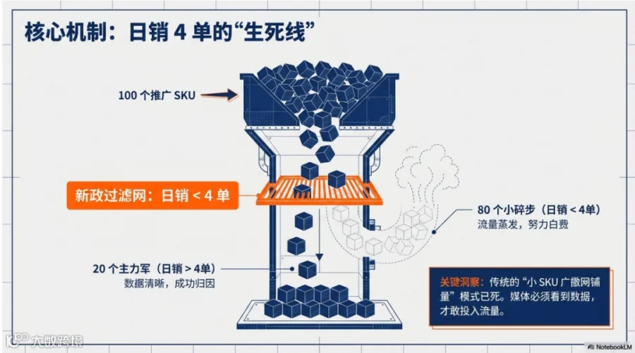 例如:若推广100个SKU中80个日销3单,新政后这80个小流量SKU转化数据将失效。对依赖"多SKU铺量"的中小媒体,此举直接导致盈利模型失效。