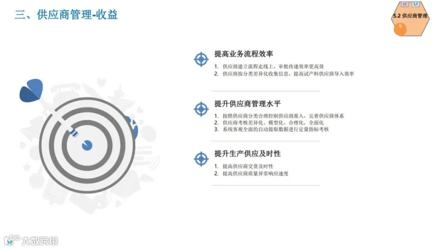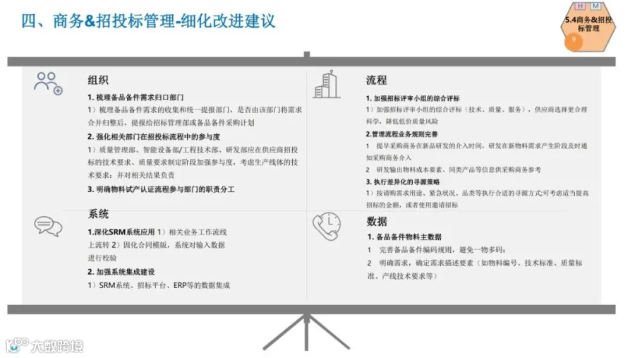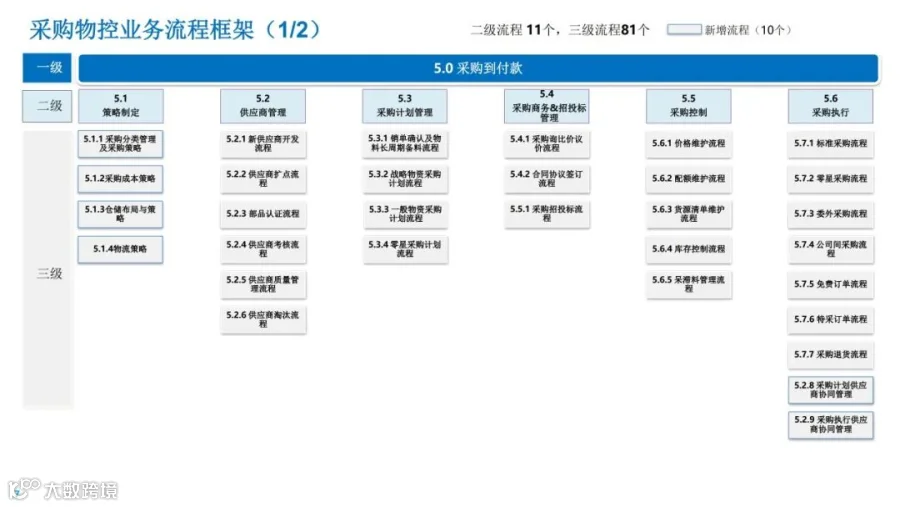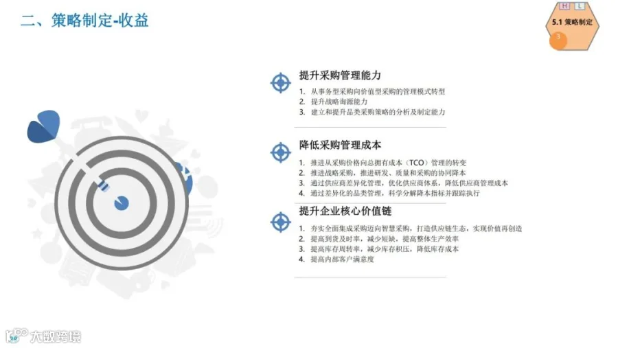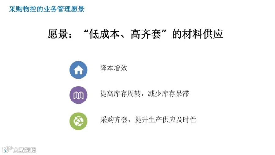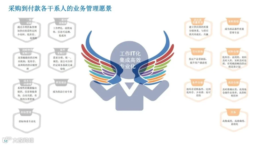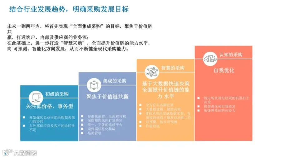 物流学习小精麟企业采购供应链规划目标:实现“全面集成采购”的目标,聚焦于价值链共赢,打通客户、内部及供应商的业务流;在此基础上,进一步打造“智慧采购”,全面提升价值的能力水平,向可预测、智能化方向发展,从而不断健全现代采购能力。