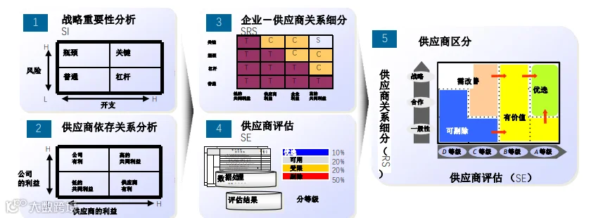 3、根据物资战略重要性分析、供应商关系分析,结合供应商评价结果,对供应商进行结构优化
