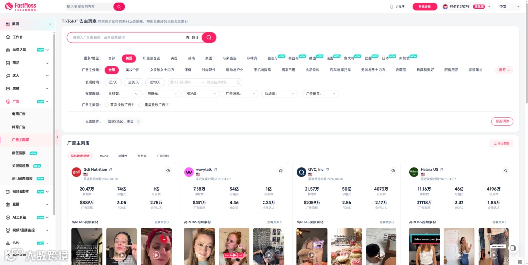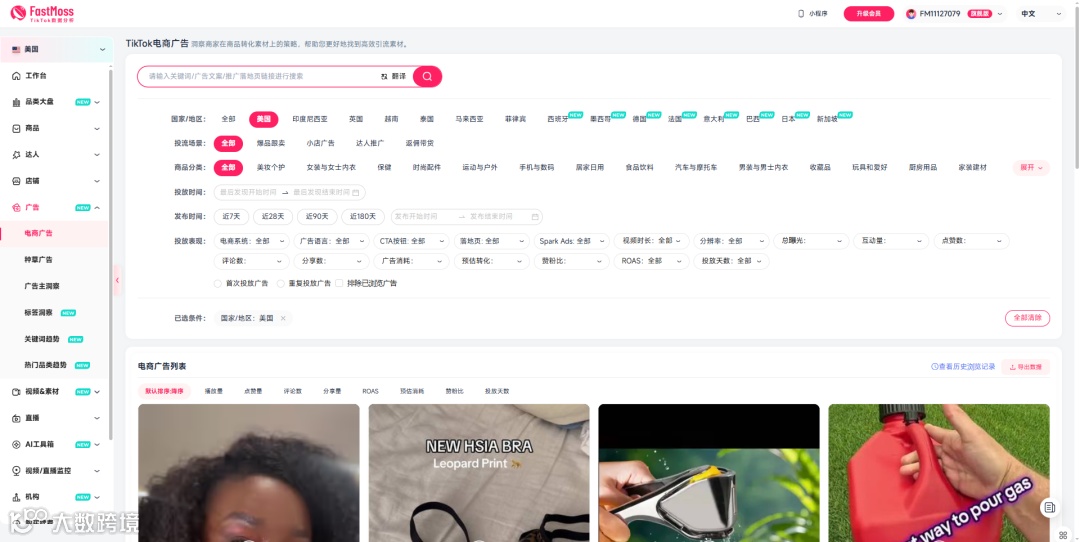 光知道一个爆款还不够,我们还要知道同类的其他玩家怎么投。在 FastMoss 的 电商广告模块(TikTok E-commerce Ads)里,你可以按国家、品类、投放时间、甚至 ROAS、CPA 等硬核指标去筛选,直接看到美国市场最近哪些视频在疯狂收割流量。