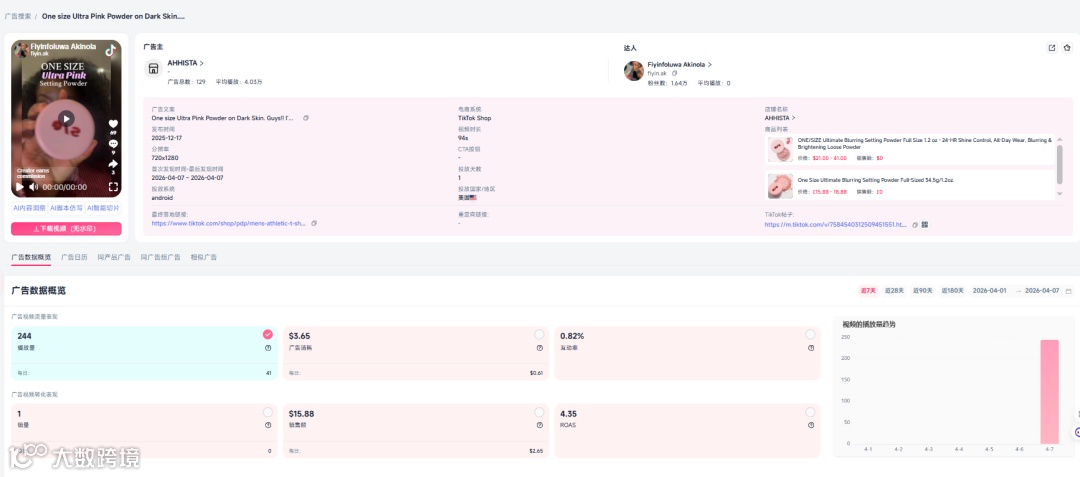 在图中可以看到,这款单品的 TikTok 全链路广告数据被完整还原:
