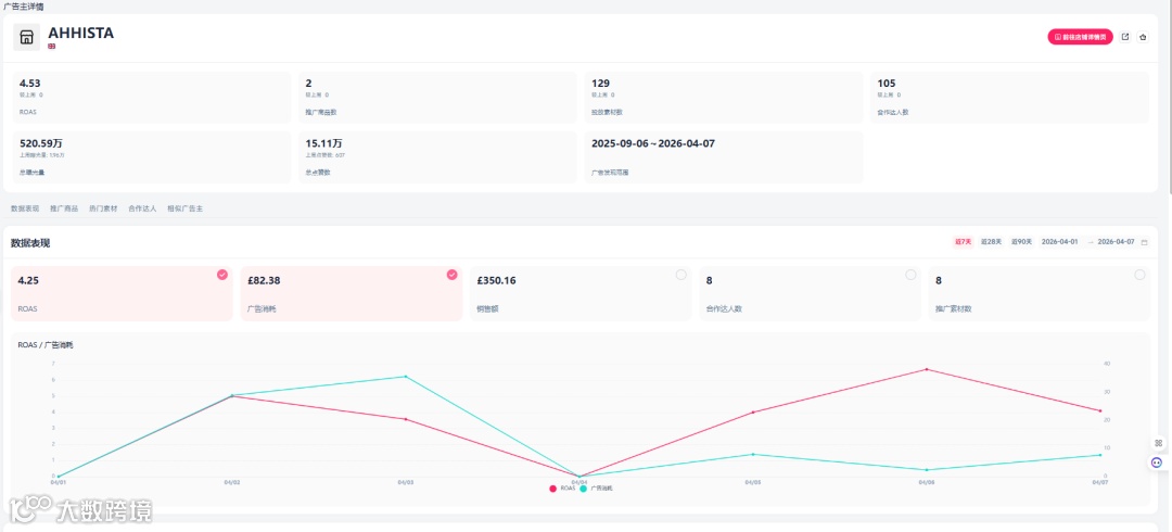 想进一步看透背后的玩家?进入 广告主详情页,FastMoss 会把某个品牌(如 AHHISTA)的投放数据聚合起来:总 ROAS 4.53、素材数 129、合作达人 105、总曝光 520.59万……你能判断它是靠“精品素材砸钱”还是“达人铺量”。