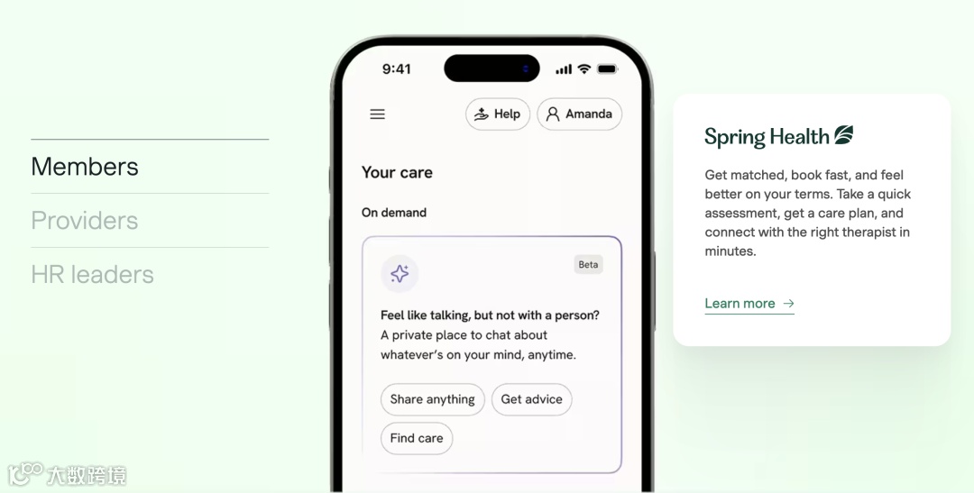 Spring Health成立于2016年,总部位于美国纽约,是全球领先的AI驱动心理健康解决方案提供商,专注为雇主与健康保险方构建“精准心理健康(Precision Mental Healthcare)”平台。公司以消除心理健康服务获取障碍为使命,依托经临床验证的AI算法,整合评估数据与庞大临床服务网络,智能匹配心理咨询、精神科诊疗、教练辅导及自助数字化干预等方案,支持30余种语言,覆盖200多个国家和地区。目前服务数百家企业与健康计划,覆盖人群达数千万,采用B2B订阅与按使用计费模式。