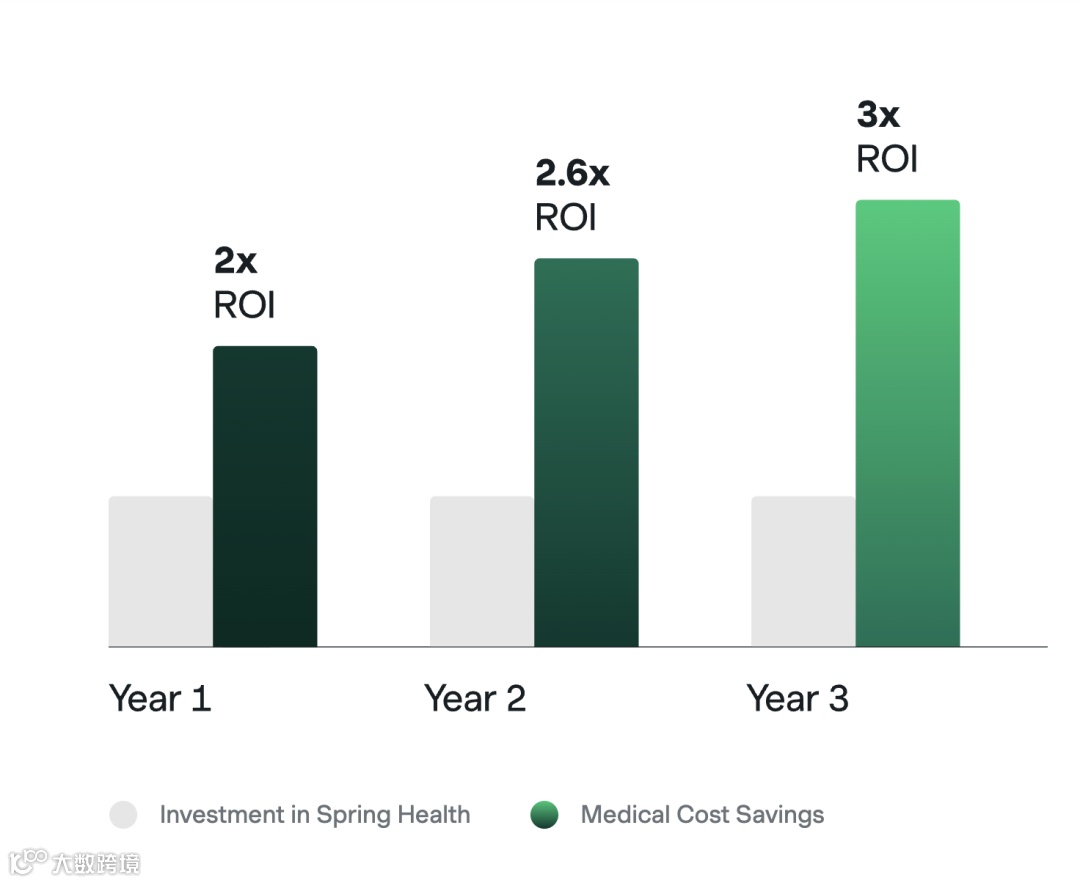 多项独立研究验证其临床与经济价值:发表于JAMA Network Open并经Validation Institute认证的数据显示,在数万名来自数百家美国雇主的员工样本中,使用Spring Health服务者在抑郁/焦虑缓解率、症状改善幅度等关键指标上显著优于对照组;两至三年随访期内,行为健康支出与整体医疗费用均呈统计学显著下降,雇主端获得可观净ROI,并伴随离职率与缺勤率同步降低——这些实证成为其拓展大型客户的关键支撑。