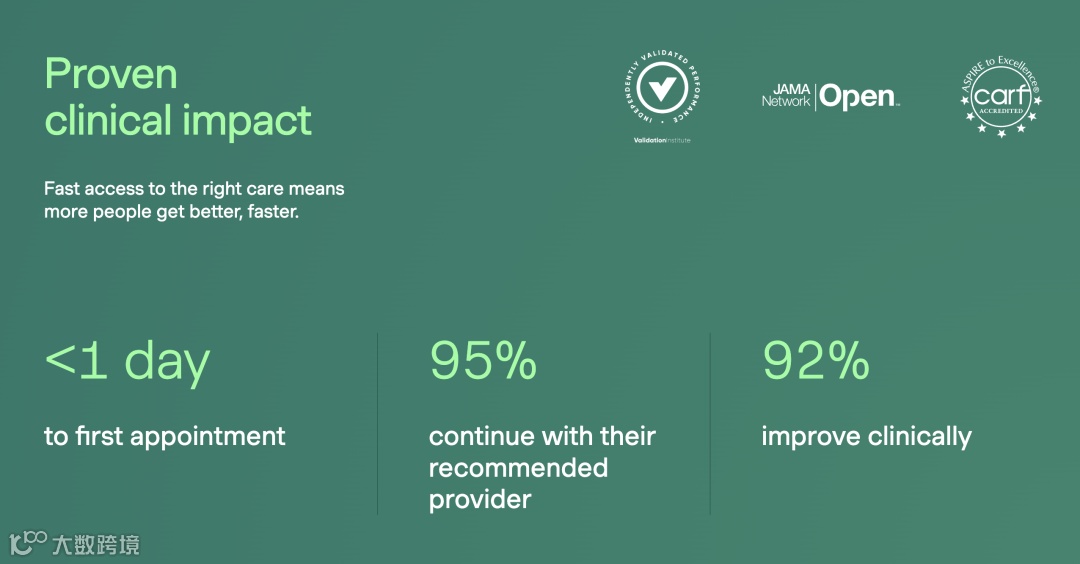其核心竞争优势体现在三方面: 一、数据与算法壁垒:基于大样本匿名临床与行为数据训练的匹配模型,已在多项研究与第三方认证中验证疗效与恢复速度优势; 二、渠道与生态锁定:与微软、Target、J.P. Morgan、Delta等跨国企业直签,深度集成Workday、Guardian Life等HR系统与保险平台,客户替换成本高,具备全球化扩展基础; 三、产品纵深与人群覆盖:持续拓展家庭、青少年、高急性需求人群等细分场景,向贯通组织与家庭的心理健康基础设施演进。