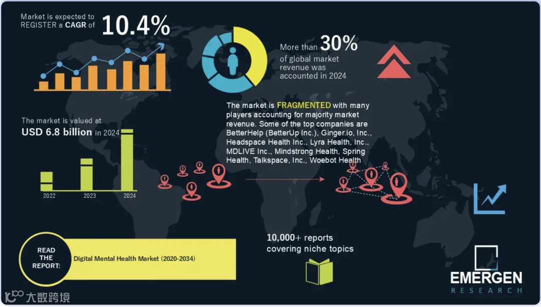 全球数字心理健康正加速成为医疗与员工福利体系的刚性基础设施。Emergen Research数据显示,2024年全球市场规模约68亿美元,预计2034年达183亿美元,年复合增长率超10%;其中北美占比约41%,雇主场景为增长最快终端之一。驱动因素包括心理疾病高发与专业资源短缺的结构性矛盾,以及疫情后远程办公普及、职场压力加剧与人才竞争白热化,促使企业将心理健康纳入核心人力资本战略。