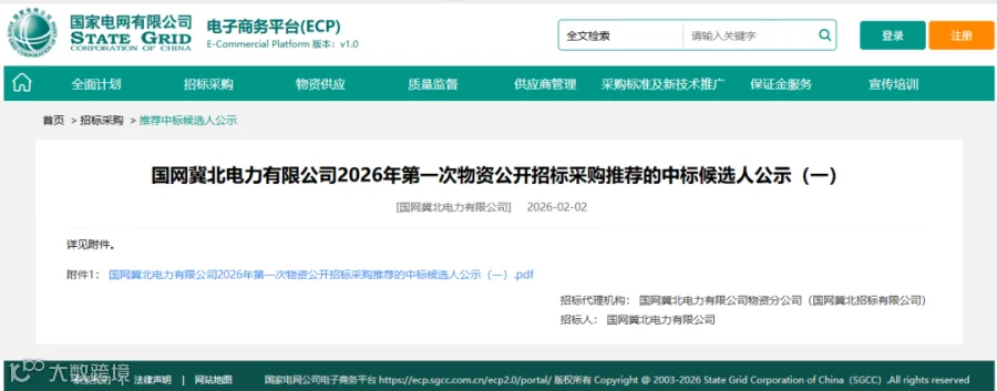 国网冀北电力有限公司2026年第一次物资公开招标采购项目推荐的中标候选人公示(一)