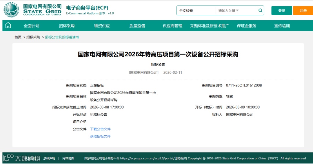 国家电网有限公司2026年特高压项目第一次设备公开招标采购招标公告/投标邀请书