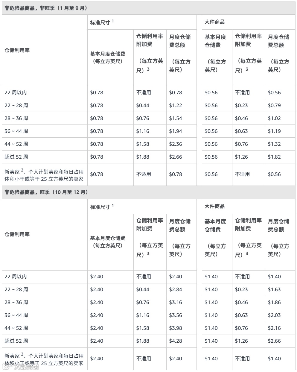 亚马逊仓储费分淡旺季,且按尺寸分段进行差异化定价。包含基础月度仓储费和仓储利用率附加费(若满足标准则收取)。以下是月度仓储费费率详情: