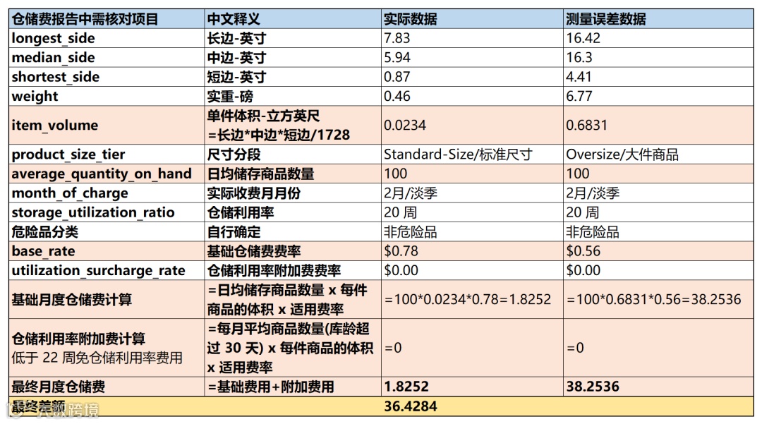 为了方便大家快速排查,这里我标注出了报表中需要重点注意的项目及其中文释义,并且以某款SKU举例作为参考。可参照下表列举的项目整理SKU相关信息,快速精准核算误差费用: