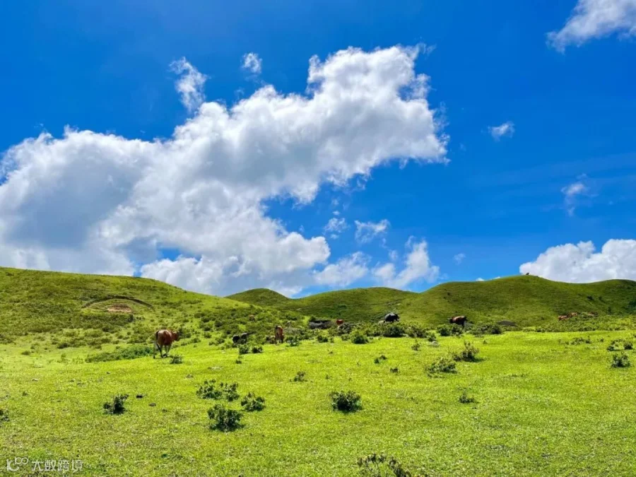 这里水草丰盛,空气清新,吸引来牛羊成群,它们或啃草、或嗜睡、或散步,悠哉悠哉这里的草甸,一座接着一座,连绵起伏,似有韵律。