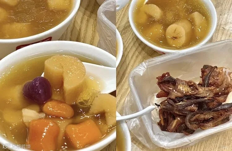 历史悠久的传统药膳龟苓膏。这里也是龟苓膏的发源地,几块钱一碗,可以加各种配料。