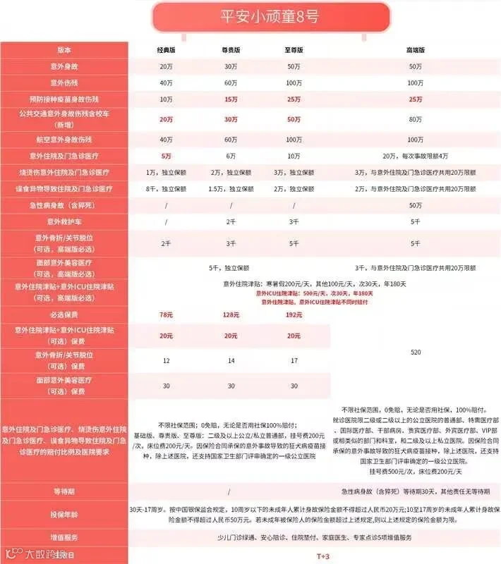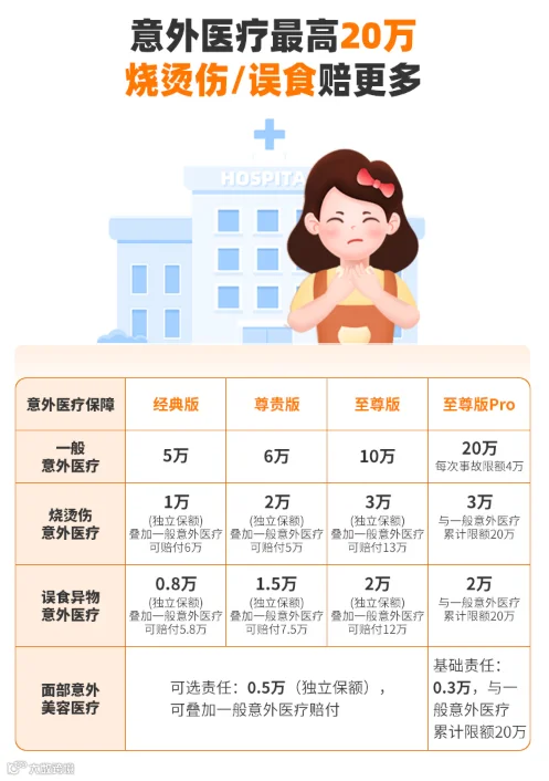 这次小顽童8号高端版意外医疗(含门诊住院),保额高达20万,每次事故限额2万,家长们不用再担心意外医疗保额不够用了。