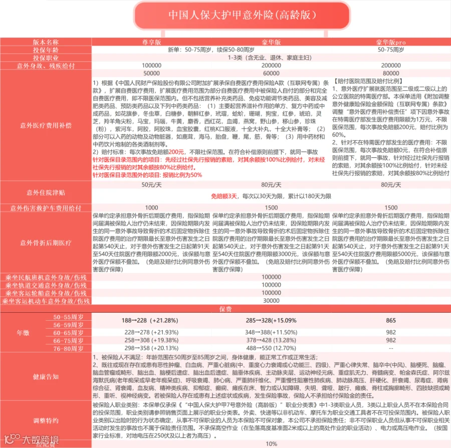 中国人保大护甲8号意外险(高龄版)是团队的“银发护卫”,专为50-75岁的中老年人设计,投保年龄广,保障重点覆盖骨折、救护车等老年人高频风险,同样刚刚迭代。