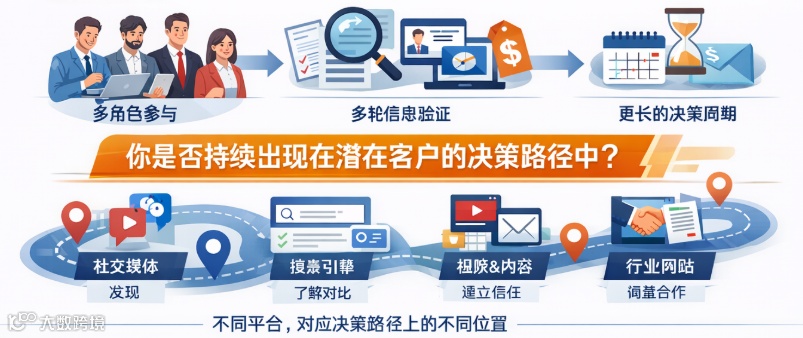 To B采购具有多角色参与、多轮信息验证和长周期特性,关键目标并非即时成交,而是持续出现在客户决策路径中。不同平台对应路径的不同阶段: