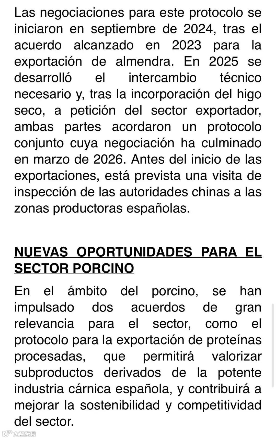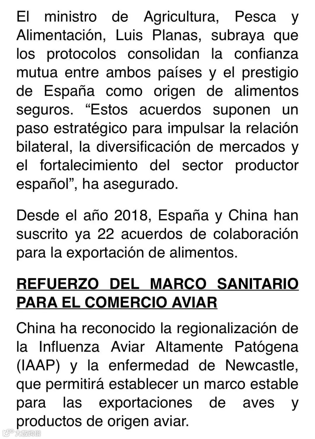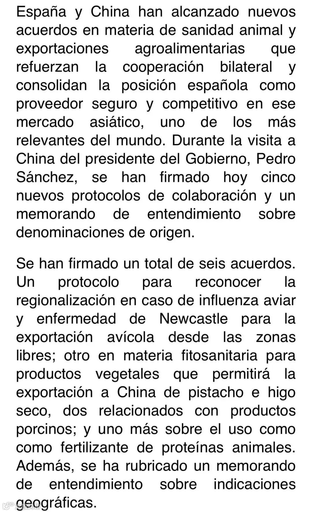 西班牙首相桑切斯访华期间,中西签署六项农食协议。中国正式认可西班牙高致病性禽流感和新城疫区域化管理原则,允许非疫区禽肉继续输华。此外,熟制猪肉获准出口中国,双方还就开心果、无花果干市场开放及动物蛋白肥料等达成协议。自2018年以来,中西已累计签署22项食品出口协议。