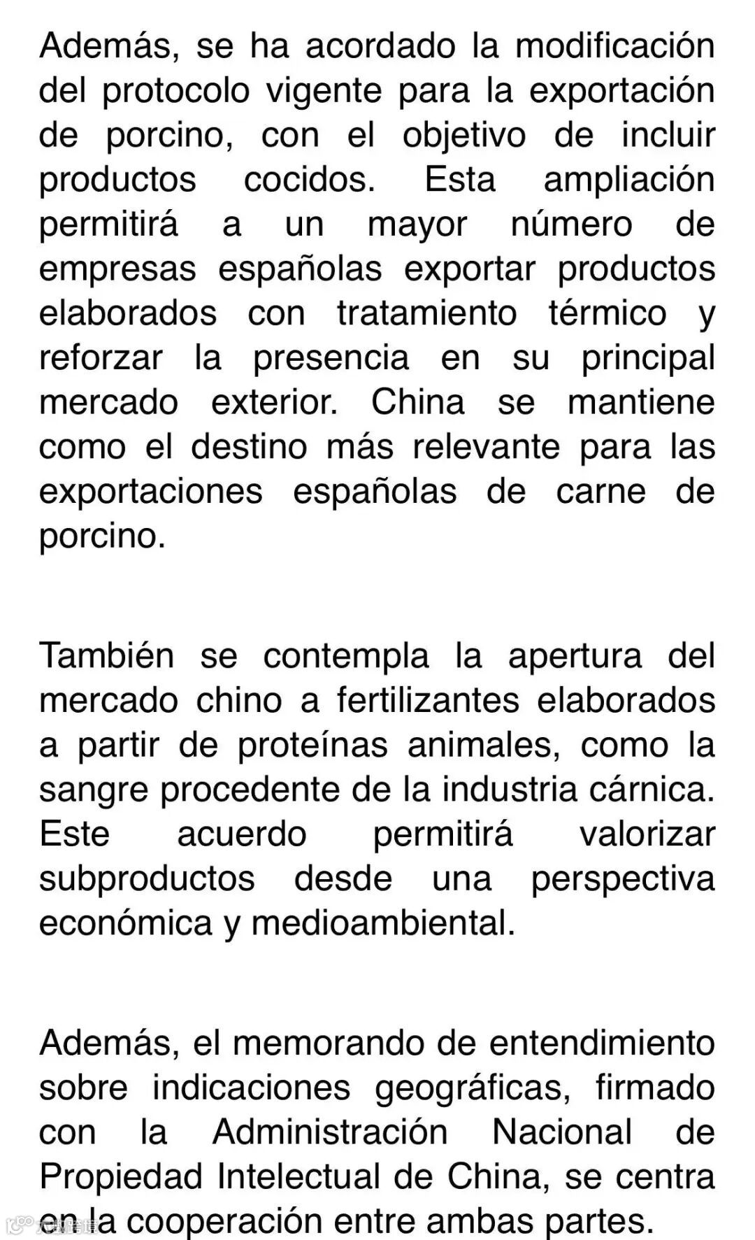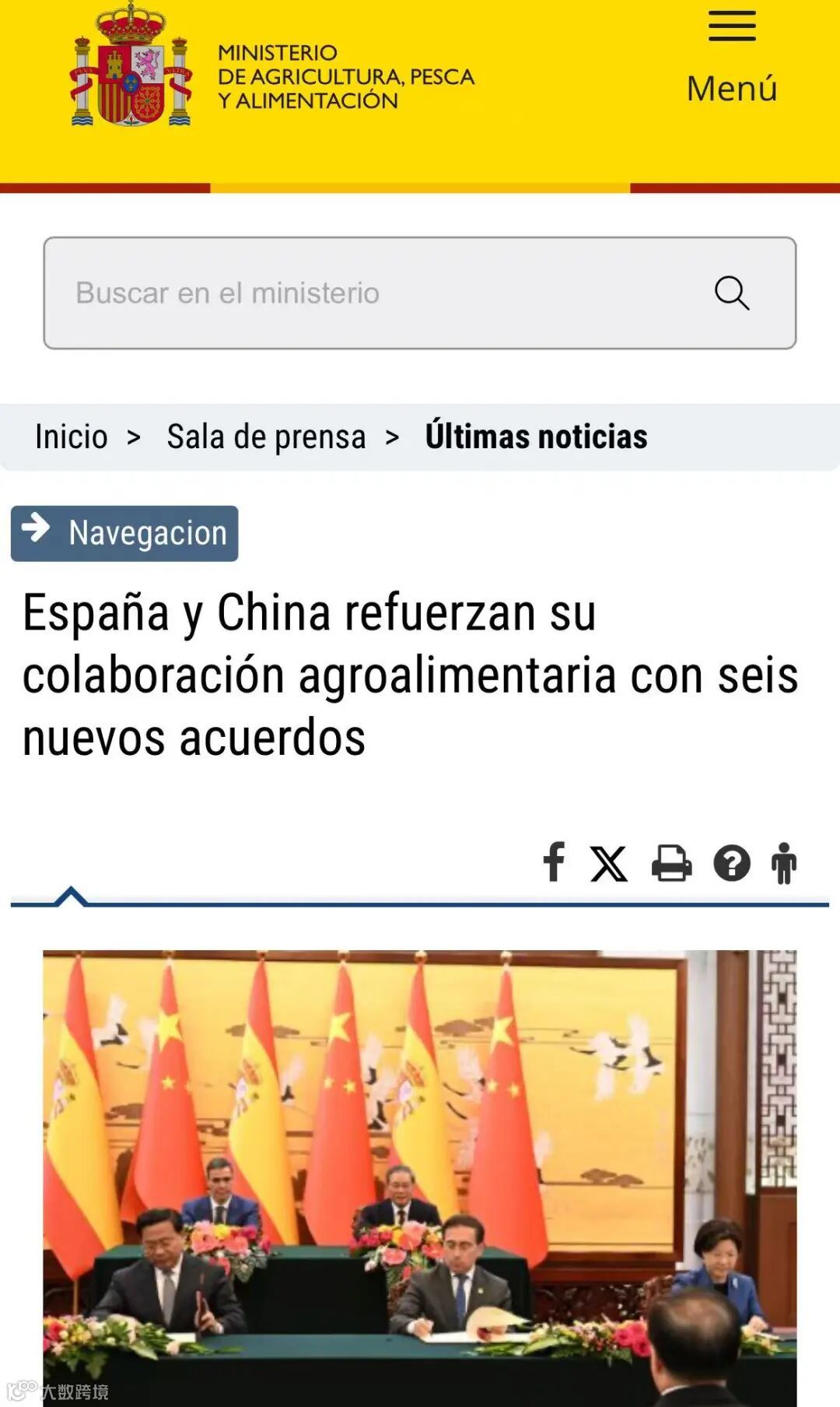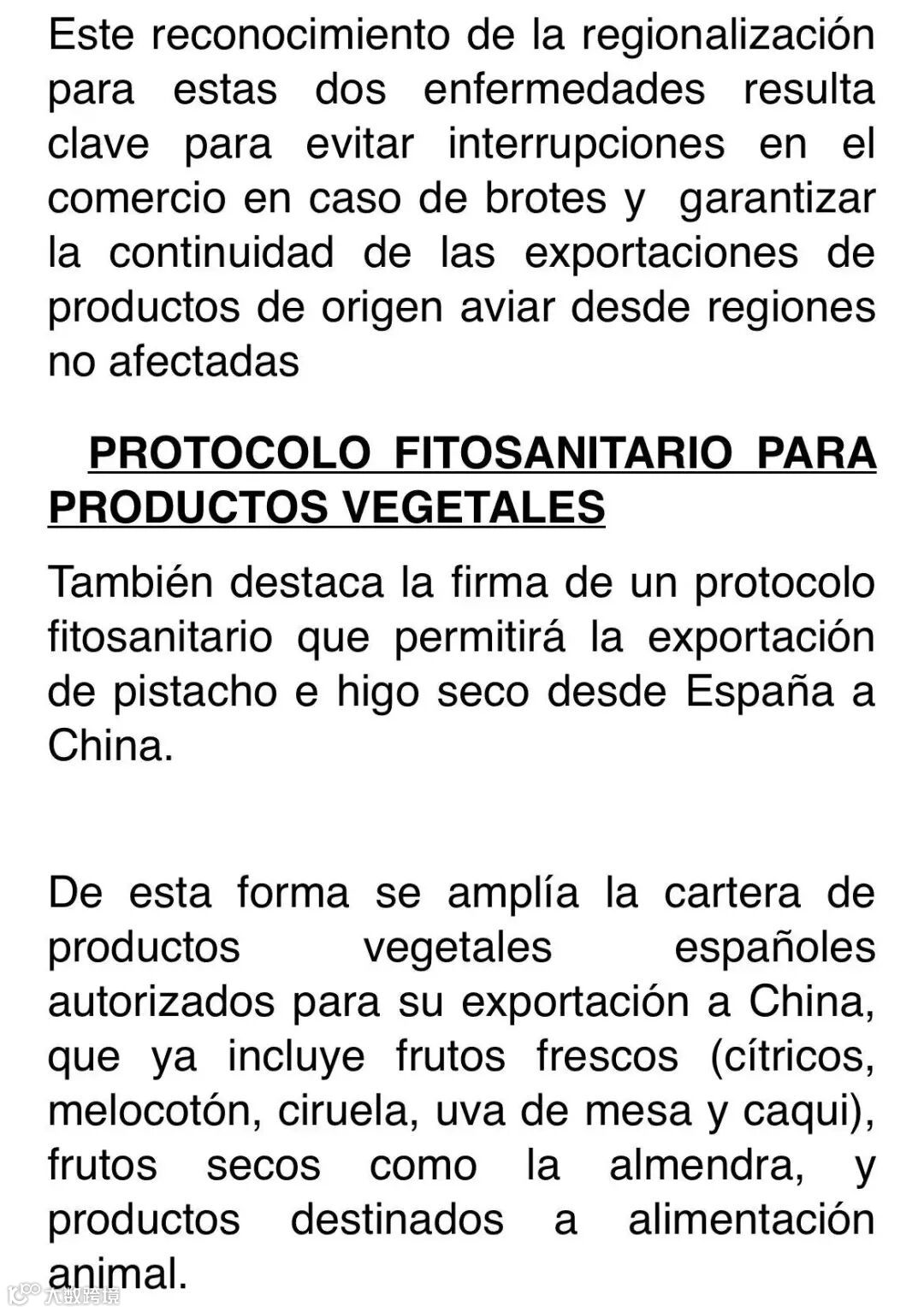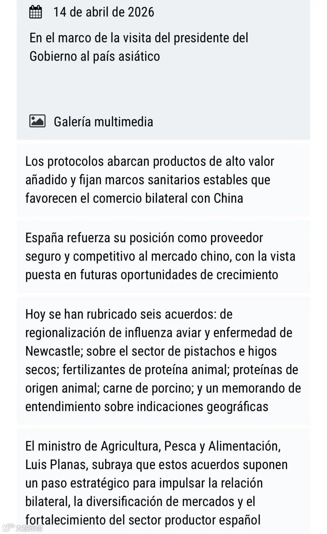 西班牙首相桑切斯访华期间,中西签署六项农食协议。中国正式认可西班牙高致病性禽流感和新城疫区域化管理原则,允许非疫区禽肉继续输华。此外,熟制猪肉获准出口中国,双方还就开心果、无花果干市场开放及动物蛋白肥料等达成协议。自2018年以来,中西已累计签署22项食品出口协议。