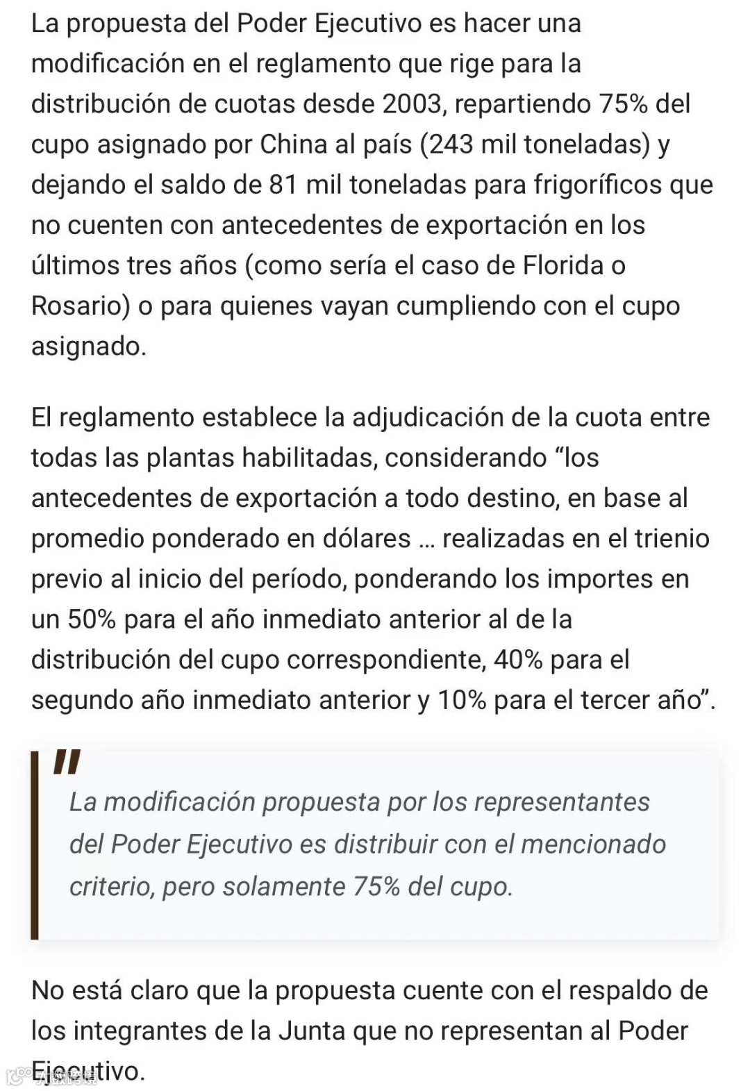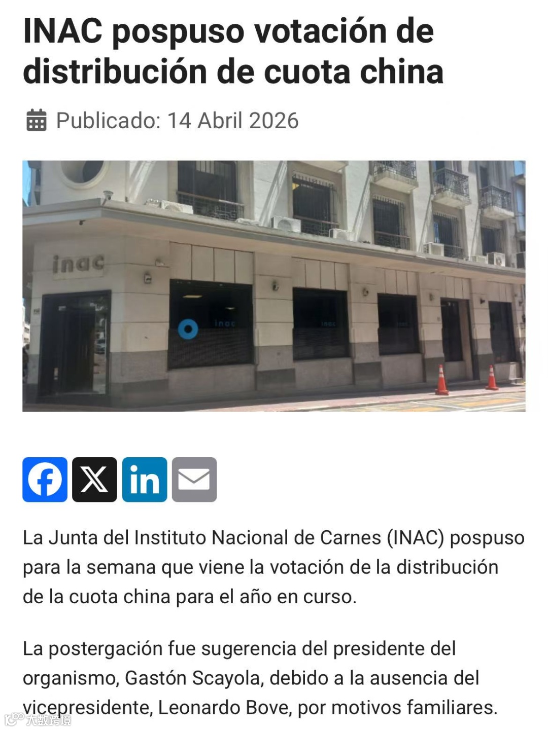 乌拉圭国家肉类协会(INAC)将本年度中国牛肉配额(32.4万吨)分配投票推迟至下周。拟调整分配规则:75%(24.3万吨)按历史出口业绩分配给传统工厂;剩余25%(8.1万吨)专门留给近三年未对华出口的新工厂或用于补充产能。现行规则以企业前三年出口额加权分配全部配额,新提案将首次单独设立新厂份额。