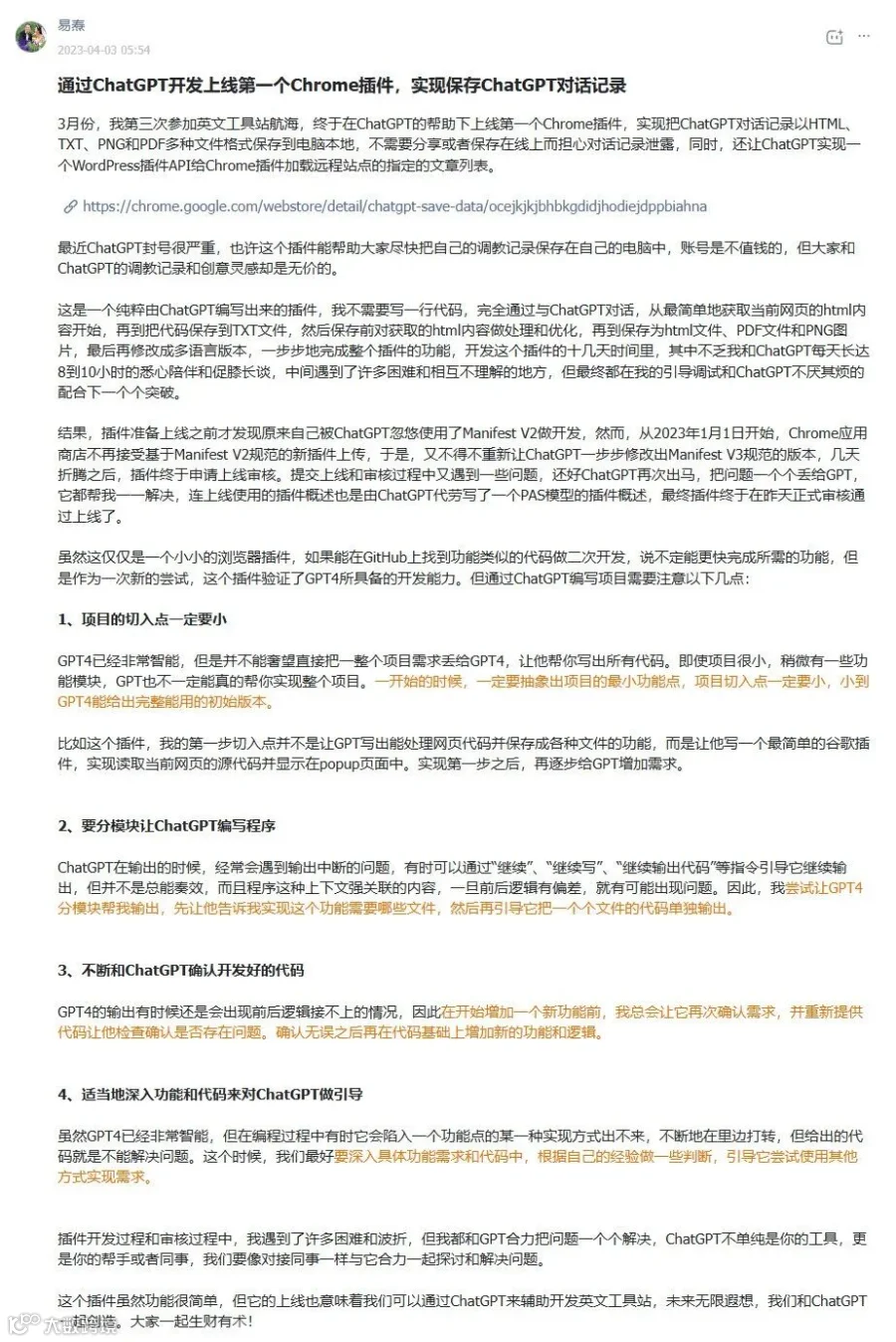 可见当时的我对AI编程有多么痴迷和投入。我还在文中提及我在使用ChatGPT编程的实践过程中总结出来的4个AI编程思路,现在看来,这些思路着实不值一提,但在那时却引起了生财有术官方工作人员的注意,邀请我在当时的英文工具站航海做了一次分享: