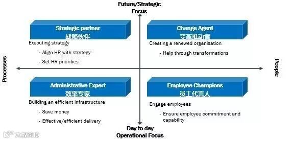 在目前HR研究领域最著名的尤里奇教授看来,企业的人力资源部门应扮演四种角色:战略伙伴、效率专家、员工代言人和变革推动者。同时,四种角色的重要性程度会随着企业经营环境的变化而变化。