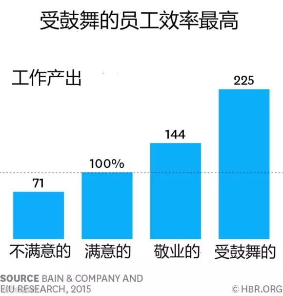 他们发现,若是以满足的员工的工作产出为基准(100分),敬业的员工的工作产出为144分,而受鼓舞的员工的工作产出则高达225分。也就是说,2.25名内心满足的员工,其工作产出才相当于一位受鼓舞员工的工作产出。