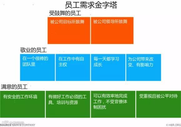 贝恩咨询与经济学人智库联合发起的一项新研究指出,很多公司倾向于简化对员工敬业度的理解,把敬业度等同于员工的个人满足感。研究员Eric Garton和Michael C. Mankins认为在考量员工敬业度时,应该参照马斯洛需求层次理论,员工的敬业程度因此可以分为3个层次。