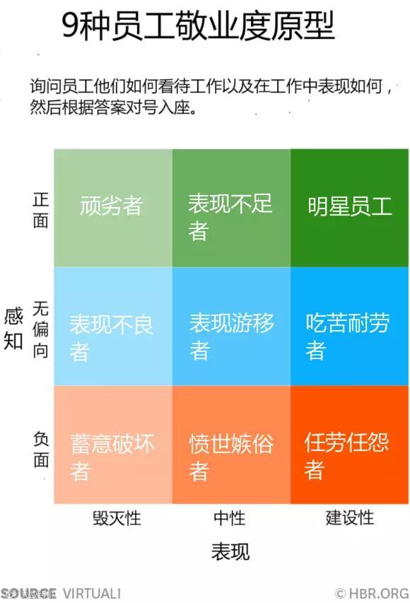 Virtuali通过调查问卷与采访的形式考察员工在这6个方面的认知:公司文化、工作职责、晋升、公司领导力、管理和整体工作回报。与此同时,Virtuali还分析员工自报的6个方面的行为表现:努力程度、个人发展、公司忠诚度、休闲娱乐、人际关系和性格特点。通过比对认知和行为,Virtuali提出了9种员工敬业度原型。