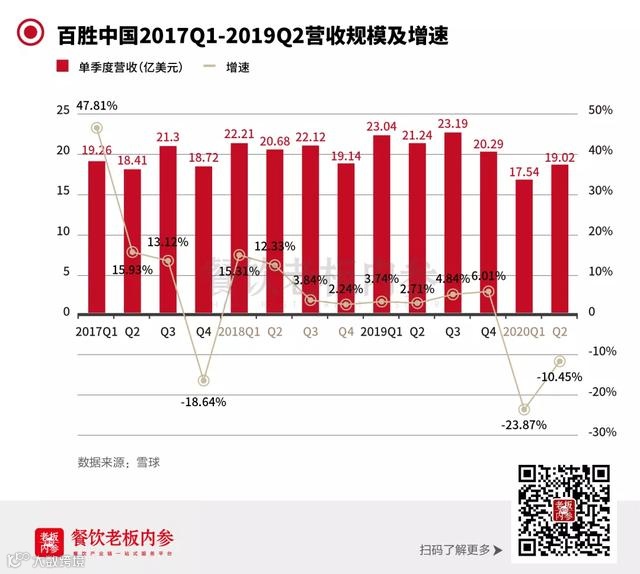 最近,麦当劳全球和百胜中国相继发布财报。2020年第二季度,麦当劳总营收同比下滑30.47%,百胜中国净利润同比下降26%。百胜中国总收入19.26亿美元,同比下降10.45%,其中肯德基的销售额下降6%,必胜客的销售额下降12%。营业收入上,百胜中国从2017-2019年收入都在持续上升,但是收入增速逐年下降,2018年第二季度之后,百胜中国的营收增速一直没有超过10%。