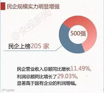 第二,205家民营大企业的营业收入总额达到143082.77亿元,同口径同比增长了11.49%;资产总额达到229070.84亿元,同口径同比增长了17.49%;利润总额达到6367.28亿元,同口径同比增长了29.03%,显著高于国有企业的利润增幅。更重要的是,在经济新常态条件下,民营大企业与国有大企业的利润增幅相比,出现了完全相反的增长趋势。