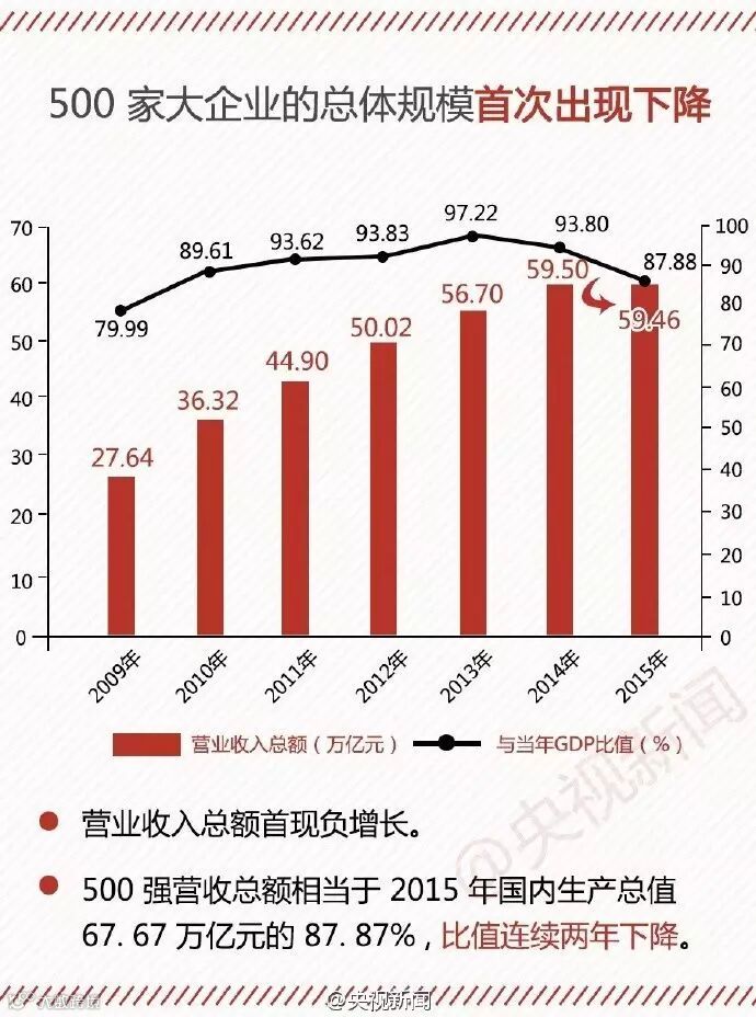 2016中国企业500强的营业收入总额达到了59.46万亿元,与上年中国企业500强营收总额持平;500强营收总额相当于2015年中国国内生产总值(GDP)67.67万亿元的87.87%,比值连续两年下降。