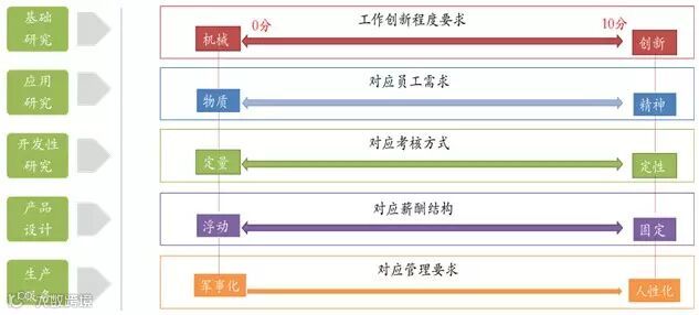 研发技术人员的工作具有高创新的特点,其员工需求在马斯洛需求层次理论中属于高层需求,其对应考核方式对应“定性定量结合定性为主”,一般而言,其对应薪酬结构偏向固定部分占更高比重,其对应管理要求更适宜于人性化的管理方式。依照从事上述五种不同类型工作的员工,其侧重高比例有所差异,其基本趋势如下图所示,基础研究人员工作创新程度最高,其精神需求层次最高,考核方式为定性考核,薪酬基本固定,人性化管理方式是其主要管理方式,其它各项工作以此类推。如下图所示: